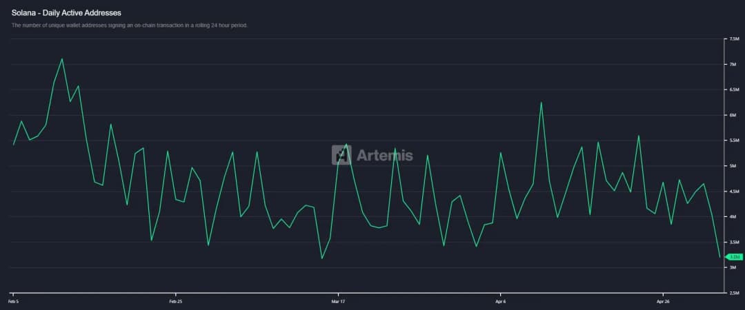 این موضوع نشان میدهد کارمزد بالای سولانا لزوماً سیگنال صعودی نیست. علاوه بر این، دادههای درون زنجیرهای نشان میدهد مشارکت معاملهگران کاهش یافته و فعالیت در شبکه افت کرده است. در ۲۴ ساعت اخیر، تعداد آدرسهای فعال روزانه و تعداد تراکنشها بهطور محسوسی کاهش یافت؛ برای مثال تعداد آدرسهای فعال به ۳.۲ میلیون رسید.