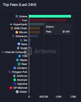 بر اساس دادههای Artemis، سولانا بیشترین کارمزد را در بازار طی ۲۴ ساعت گذشته تولید کرد و معادل ۱.۴ میلیون دلار کارمزد از فعالیت در شبکه بهدست آمد.