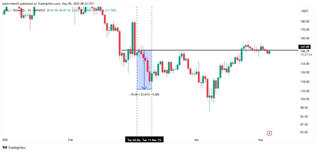 اگر خروج نقدینگی از پروتکلها و کاهش فعالیت معاملهگران ادامه داشته باشد، ممکن است SOL در روزهای آینده افت بیشتری را تجربه کند.