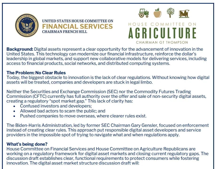 این پیشنویس بحث که به رهبری روسای کمیته کشاورزی و خدمات مالی مجلس، گلن تامپسون و فرنچ هیل، تهیه شده است، بازنویسی «گامبهگام اما مهم» قانون نوآوری مالی و فناوری برای قرن بیستویکم (FIT21) است، جاستین اسلاتر، معاون امور مقرراتی پارادایم، در پستی در ایکس در تاریخ ۵ مه نوشت.