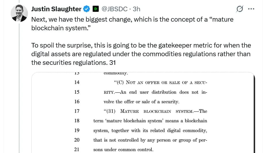 پیشنویس همچنین «سیستم بلاکچین بالغ» را سیستمی تعریف میکند که همراه با کالای دیجیتال مرتبط با آن، تحت «کنترل مشترک» هیچ شخص یا گروهی نیست.