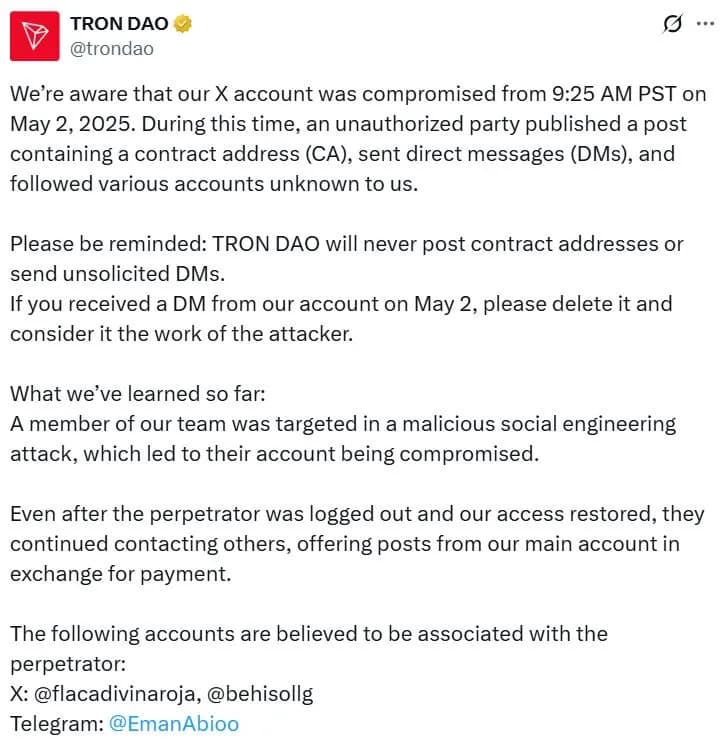 پس از بازیابی دسترسی، Tron DAO در یک بهروزرسانی در X در تاریخ ۲ مه اعلام کرد که آنها گمان میکنند هک ناشی از «هدفگیری یک عضو تیم در یک حمله مهندسی اجتماعی مخرب بوده است که منجر به دسترسی غیرمجاز به حساب او شده است.»