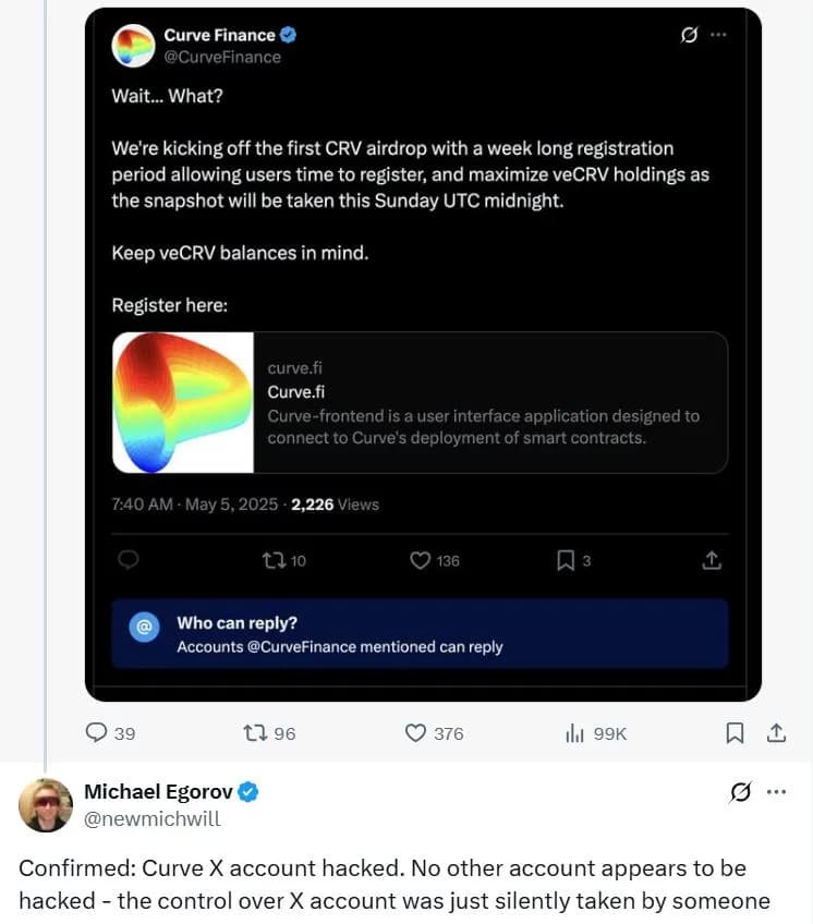 در یک پست حذفشده در X در تاریخ ۵ مه، یک کلاهبردار با نقش Curve Finance لینکی برای ایردراپ CRV با دوره ثبتنام یک هفتهای به اشتراک گذاشت که برخی کاربران تیزبین X به سرعت مشکوک شدند که ممکن است جعلی باشد.
