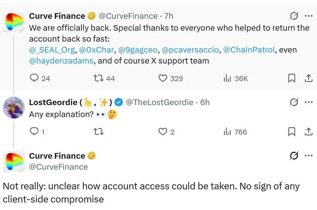 تیم Curve Finance از آن زمان با کمک گروهی شامل تیم امنیت سایبری SEAL دسترسی را بازیابی کرده و متوجه شده است که علاوه بر ارسال لینکهای کلاهبرداری، هکر برخی کاربران از جمله CrediBULL Crypto را که تسلط بر حساب را گزارش کرده بودند، مسدود کرده است.
