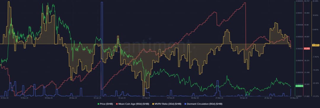 در نهایت، میانگین عمر سکه (Mean Coin Age) طی ماه گذشته روند صعودی قوی نداشته است، برخلاف بازه ژانویه تا مارس. در آن زمان، صعود مداوم MCA نشانگر تجمع گسترده در شبکه بود. گردش غیرفعال سکه چند قله در این معیار ایجاد کرد که افزایش حرکت توکن و امواج فروش کوچک را نشان میداد. نسبت MVRV سیروزه نیز دوباره به محدوده منفی بازگشت. این میتواند نشانه اولیه پایان فشار فروش از سوی دارندگان کوتاهمدت باشد و زمان لازم برای تثبیت و تجمع را برای این میمکوین فراهم کند.