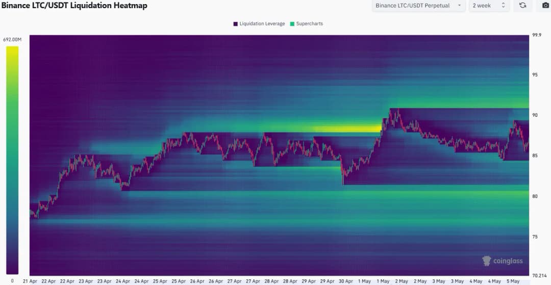 نقشه حرارتی لیکوئیدیشن دو هفتهای نشان میدهد مناطق ۸۰.۳ و ۹۱.۴ دلار بهعنوان زونهای مغناطیسی نزدیک عمل میکنند و میتوانند قیمت را به سمت خود جذب کنند. سطح ۹۱.۴ دلار در زمان نگارش خبر نزدیکتر است و هدف واقعبینانهتری محسوب میشود. مومنتوم کوتاهمدت بیت کوین [BTC] نیز احتمالاً بر حرکت LTC تأثیر خواهد گذاشت. انتظار میرود در روزهای آینده شکلگیری محدوده ادامه یابد. فقدان اطمینان صعودی همراه با سطوح لیکوئیدیشن نشان داده شده حکایت از آن دارد که لایتکوین احتمالاً پیش از حرکت بعدی، هر دو سطح را لمس خواهد کرد.