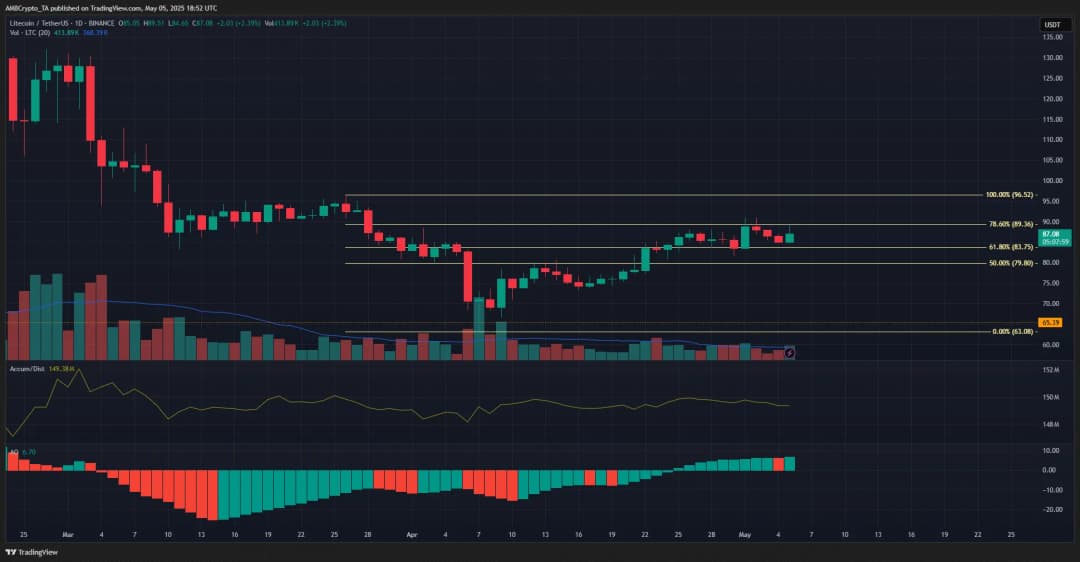 با این وجود، شاخص جریان پول (A/D) نشان داد که فشار خرید در ماه گذشته ضعیف بوده است که خبر خوبی برای سرمایهگذاران نیست. علاوه بر این، سطح ۸۹.۳ دلار نمایانگر ۷۸.۶ درصد اصلاح فیبوناچی است. خریداران LTC چند روز پیش از این سطح با مقاومت روبهرو شدند و قیمت به نظر میرسد در کوتاهمدت در محدوده ۸۳.۳ تا ۸۸.۸ دلار در نوسان باشد. تقاضای ضعیف نشان میدهد احتمال رد شدن از ۸۹ دلار بیشتر از شکست صعودی است.