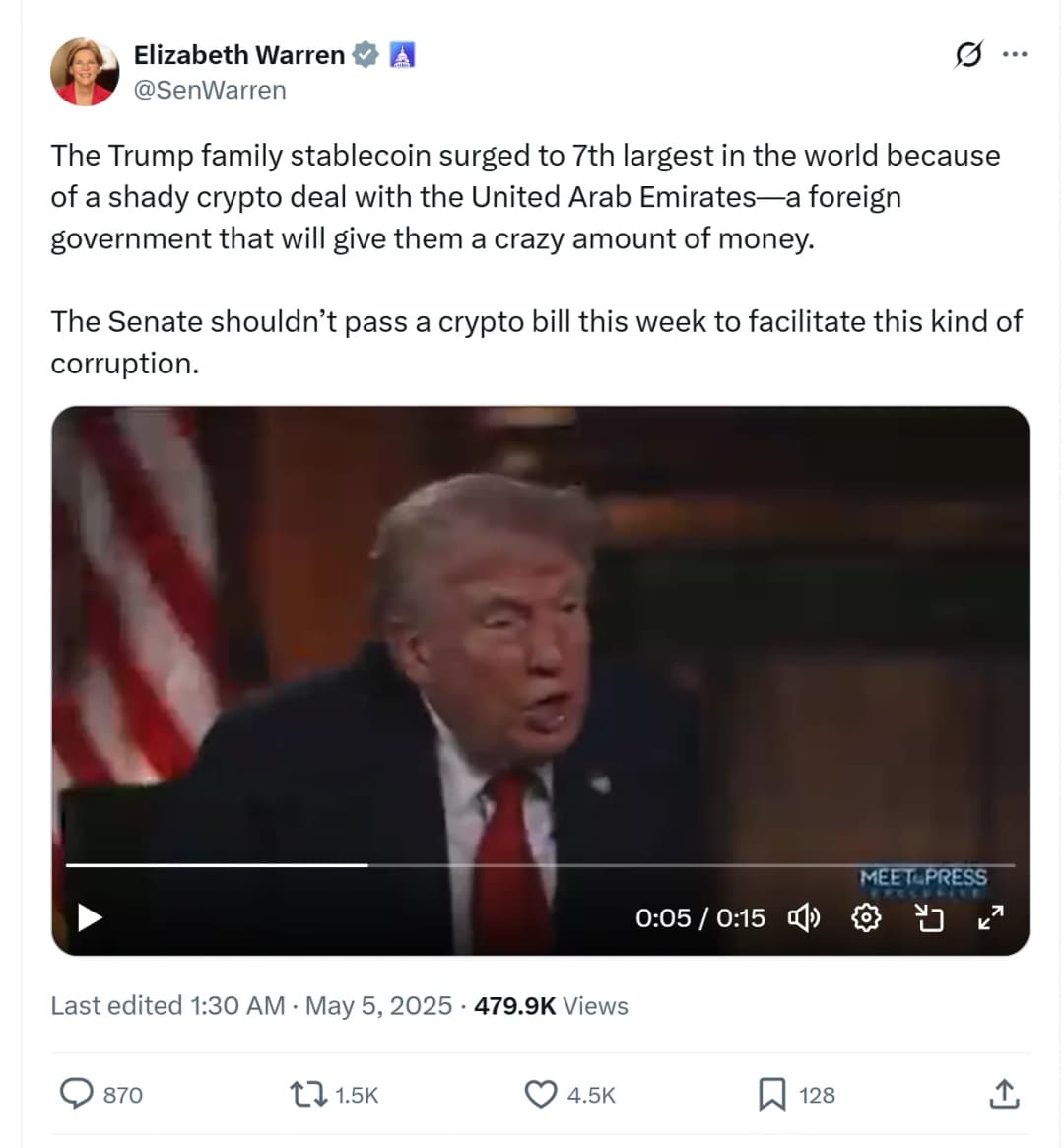 در نامهای مورخ ۵ مه به دفتر اخلاق دولتی آمریکا (Office of Government Ethics)، سناتور الیزابت وارن و جف مرکلی اعلام کردند ترامپ و خانوادهاش ممکن است از سرمایهگذاری مشترک شرکت دولتی امارات (MGX)، صرافی رمزارزی بایننس و شرکت World Liberty Financial (WLFI) سود شخصی ببرند.