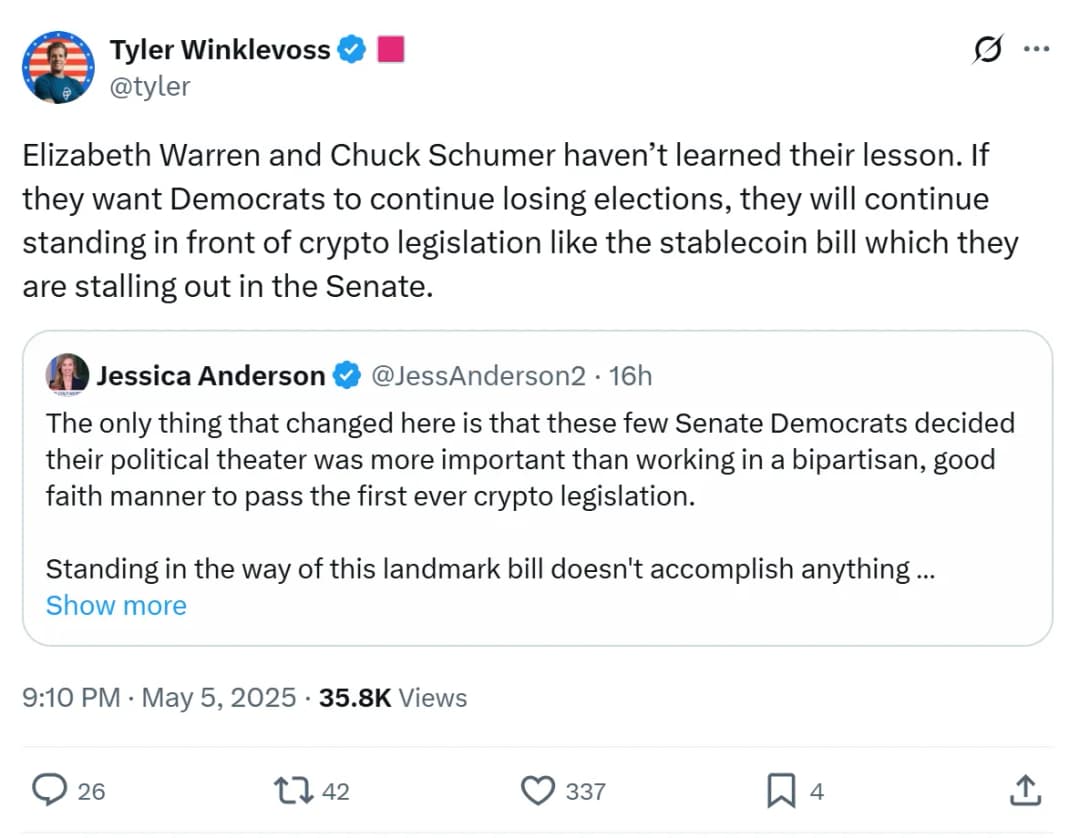 چهرههای برجسته رمزارز نیز در واکنش به مقاومت سیاسی که خطر ناکامی لوایح استیبلکوین در مجلس سنا را تهدید میکند، واکنش نشان دادهاند. تایлер وینکلووس، همبنیانگذار صرافی جمینی، در شبکه X نوشت: