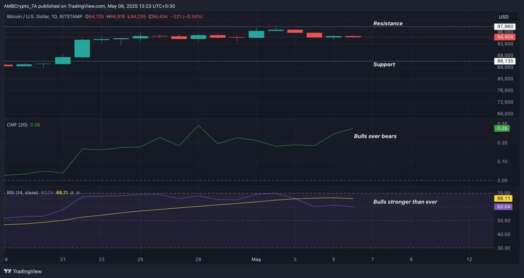 با وجود افت کوتاهمدت، شاخصهای فنی مانند جریان پول چایکین (CMF) و شاخص قدرت نسبی (RSI) همچنان روند صعودی را نشان دادند و هردو بهطور مطمئن بالاتر از محدوده خنثی باقی ماندند.