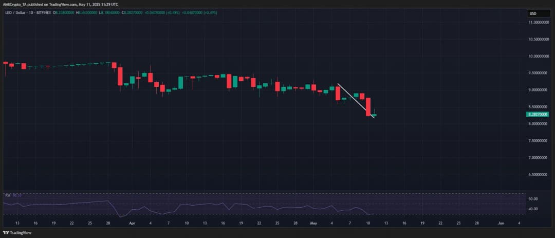 LEO با افت 7.89% از قیمت آغازین هفته، ضعیفترین عملکرد را داشت. ابتدا یک کندل قرمز 4.39% ثبت کرد و به 8.76 دلار رسید. با کاهش ترس بازار میانمدت، گاوها تلاش اندکی برای بازیابی انجام دادند، اما خرسها دوباره 6% دیگر فشار آوردند.