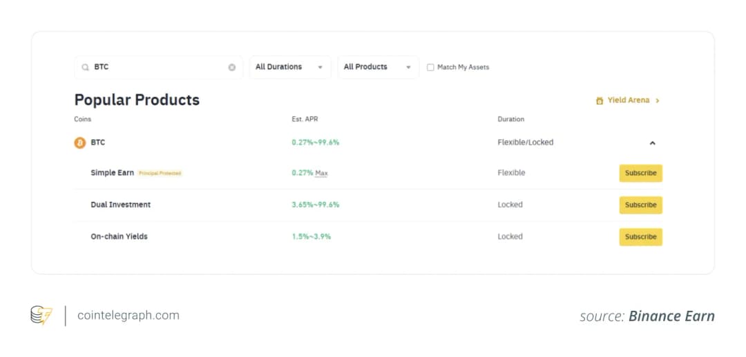بهعنوان مثال، Binance Earn گزینههای چندگانهای دارد: Simple Earn با بازده پایین و قابل پیشبینی و برداشت انعطافپذیر، Dual Investment و On-chain Yield که بازده بالاتر اما با ریسک و قفلشدگی ارائه میدهند. نرخهای فعلی را در وبسایت Binance Earn بررسی کنید.