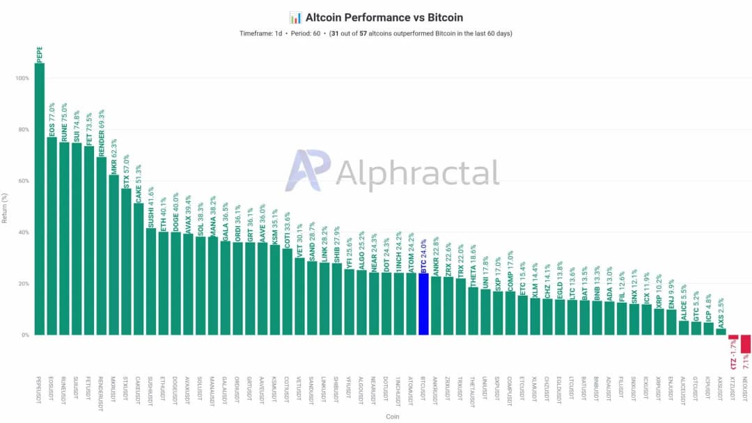 بیش از نیمی از آلتکوینهای رصدشده – ۳۱ از ۵۷ – طی ۶۰ روز گذشته از بیت کوین پیشی گرفتهاند و تغییر واضحی در شتاب بازار نشان میدهند. میمکوین Pepe [PEPE] با بازده خیرهکننده ۱۱۷٪ پیشتاز است، و پس از آن EOS [EOS]، THORChain [RUNE] و Sui [SUI] عملکرد قویای داشتهاند.