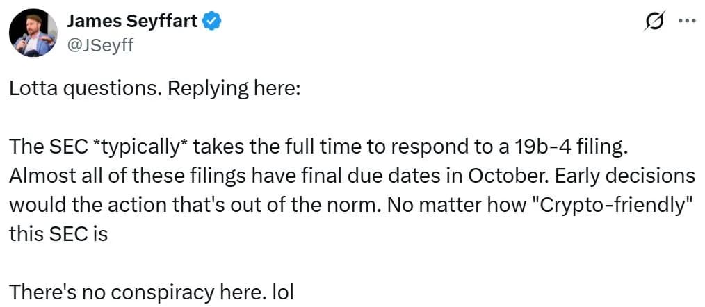 «جیمز سایفارت»، تحلیلگر ETF بلومبرگ در شبکه X گفت که این تعویقها پیشبینیشده بود، چرا که SEC معمولاً تا آخرین روز مهلت پاسخ به پرونده 19b-4 صبر میکند. «تقریباً تمام این درخواستها تا اکتبر مهلت نهایی دارند و صدور تصمیم زودهنگام غیرمعمول است.»