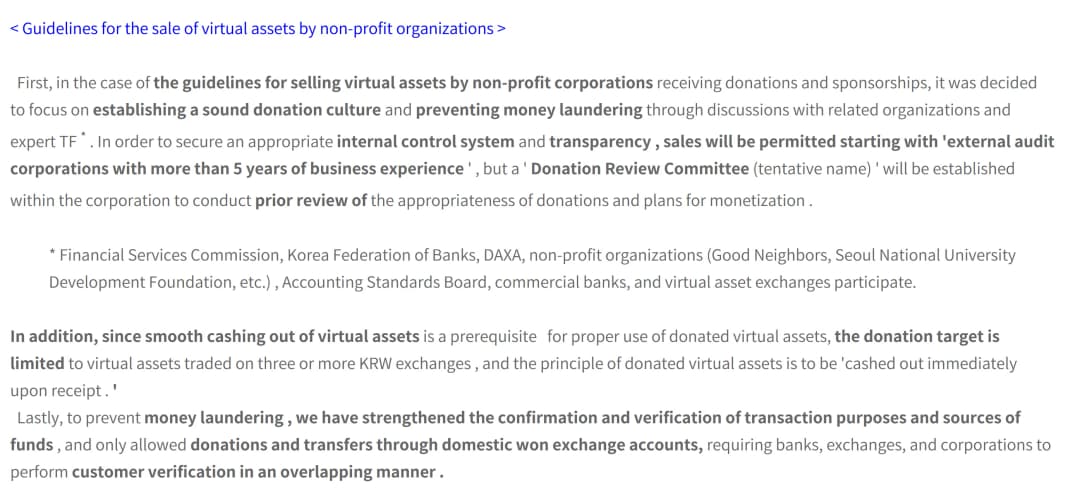 برای کاهش ریسک پولشویی، تمامی کمکها باید از طریق حسابهای تبادل وون کره تأییدشده هدایت شوند و بانکها، صرافیها و خود سازمانها مسئول تأیید باشند. تنها رمزارزهایی که در حداقل سه صرافی داخلی بزرگ فهرست شده باشند، مجاز به دریافت کمک هستند و نقدشوندگی باید بلافاصله پس از دریافت انجام شود.