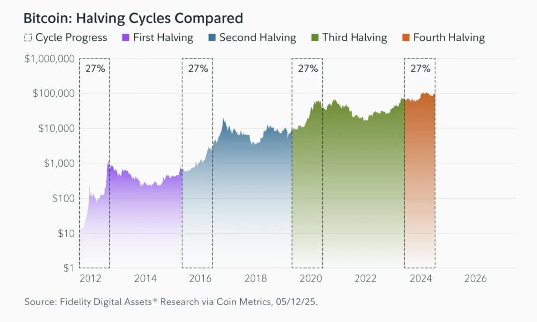 گزارش اخیر Fidelity Digital Assets نشان میدهد که چرخه بازار فعلی بیت کوین بیانگر بلوغ بازار و تعمیق و گسترش نرخ پذیرش است. در بلوک ۸۹۲۵۰۰—بهعبارتی ۲۵٪ پیشرفت در دوره نصفشدن—بیت کوین بین ۸۲۵۰۰ تا ۸۵۰۰۰ دلار معامله شد که معادل افزایش ۳۱٪ نسبت به ۱۹ آوریل ۲۰۲۴ است، زمانی که چهارمین نصفشدن پاداش بلاک را به ۳.۱۲۵ بیت کوین کاهش داد.