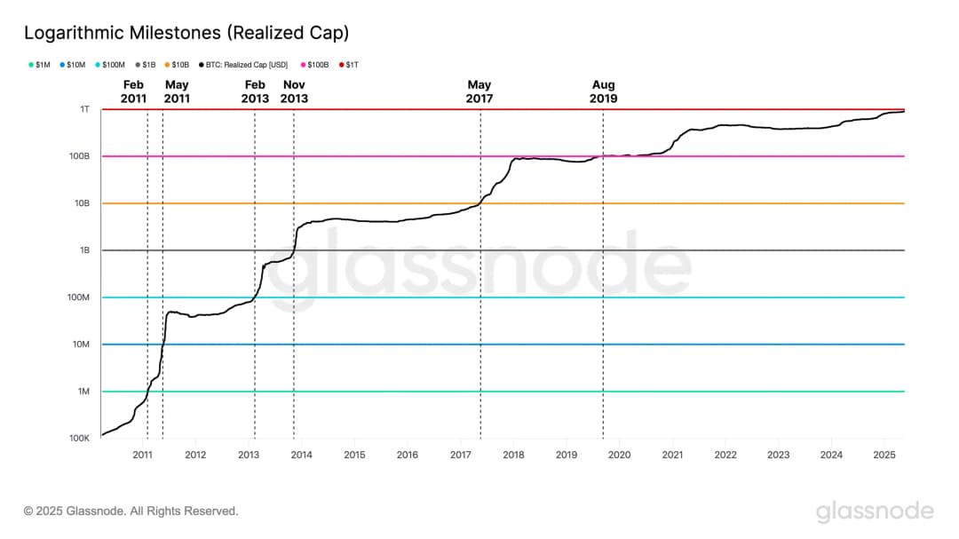 تاریخچه نشان میدهد فاز میانی این دوره همواره با اوجهای قیمتی جدید همراه بوده است—رویدادی که این هفته رخ داد. فیدلیتی اشاره کرد که این رشد ممکن است تا سهماهه دوم ۲۰۲۵ ادامه یابد و احتمالاً جایگاه بیت کوین را بهعنوان دارایی معتبر در سبدهای مدرن بازتعریف کند. شاخص ارزش محققشده (Realized Cap) بیت کوین، معیاری برای سنجش خالص جریان سرمایه ورودی است. از زمان نصفشدن ۲۰۲۴، این شاخص ۶۳٪ افزایش یافته و از ۵۶۱ میلیارد دلار به ۹۱۵ میلیارد دلار رسیده است که نشاندهنده مقیاس سرمایه واردشده به بازار است.