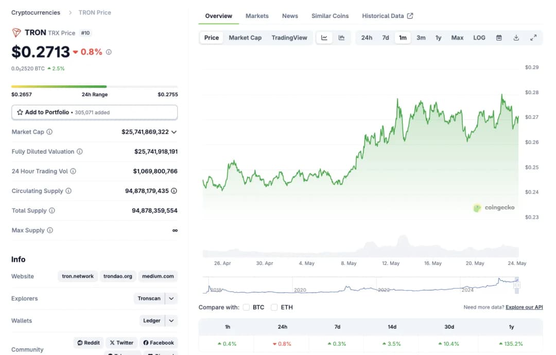 این افت پس از آن رخ داد که ارزش بازار ترون به بیش از ۲۵ میلیارد دلار رسیده و در جایگاه سیزدهم داراییهای دیجیتال قرار گرفت.