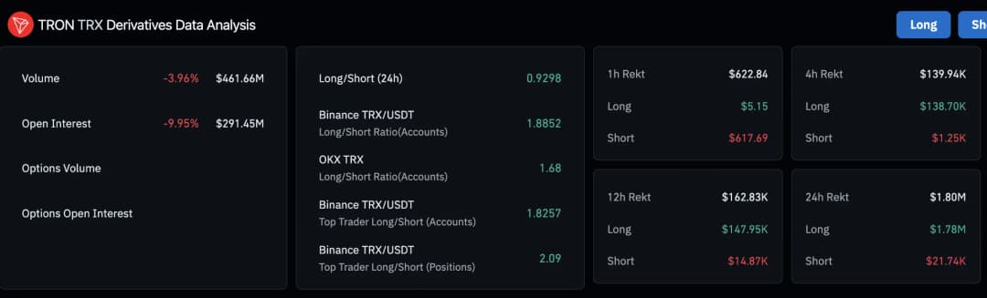 بر اساس دادههای Coinglass، حجم بازار قراردادهای آتی TRX در ۲۴ ساعت گذشته ۳.۷۴ درصد کاهش یافته و به ۴۶۲.۲۷ میلیون دلار رسیده است. همچنین قیمت باز (Open Interest) با افت ۱۰.۰۴ درصدی به ۲۹۲.۰۸ میلیون دلار کاهش یافته که نشاندهنده خروج معاملهگران است.