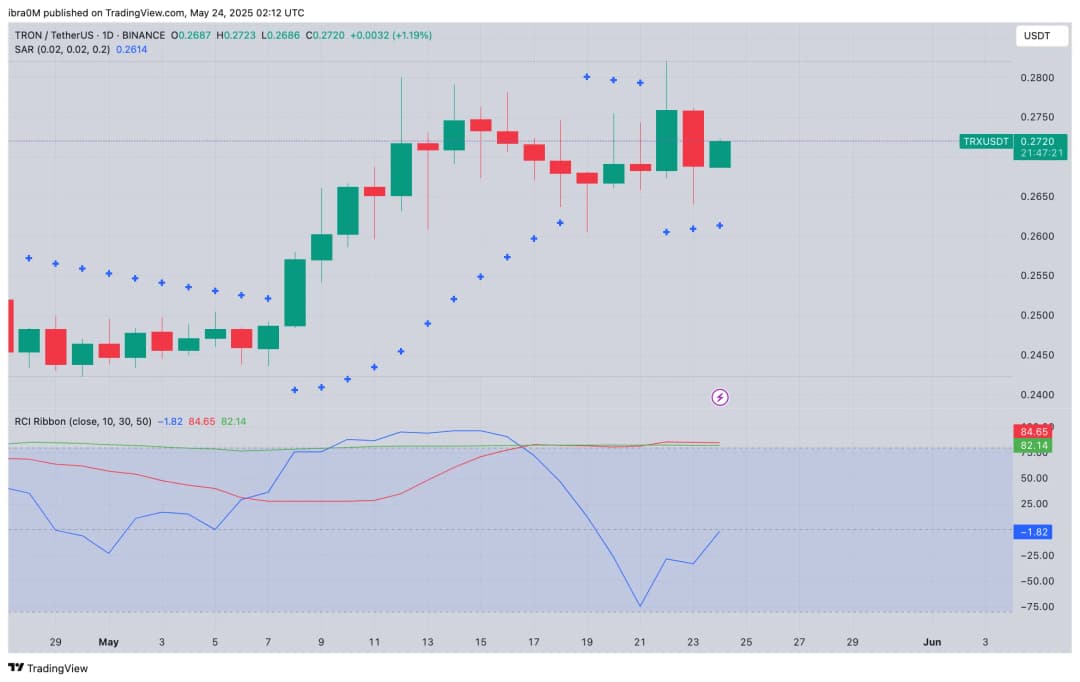 نمودار روزانه نشان میدهد TRX بالای سطح ۰.۲۶۵ دلار از حمایت برخوردار است و با قیمت ۰.۲۷۱۸ دلار معامله میشود که در ۲۴ مه ۱.۱۲ درصد رشد را ثبت کرده است. نقاط Parabolic SAR در سطح ۰.۲۶۱۴ زیر قیمت قرار دارند و از ادامه روند صعودی حمایت میکنند.