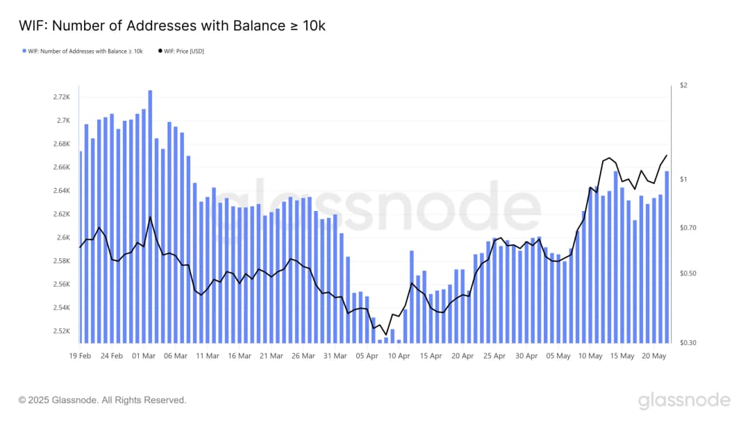 افت WIF به ۱.۱۷ دلار ممکن است خردهفروشها را بترساند اما پول هوشمند این افت را بهعنوان فرصت خرید در بازار صعودی میبیند. تعداد کیفهایی که بیش از ۱۰,۰۰۰ WIF دارند، از ۲,۵۱۵ در ۸ آوریل به ۲,۶۵۷ تا زمان نگارش گزارش رسیده است و این بالاترین شمار تاریخ است.