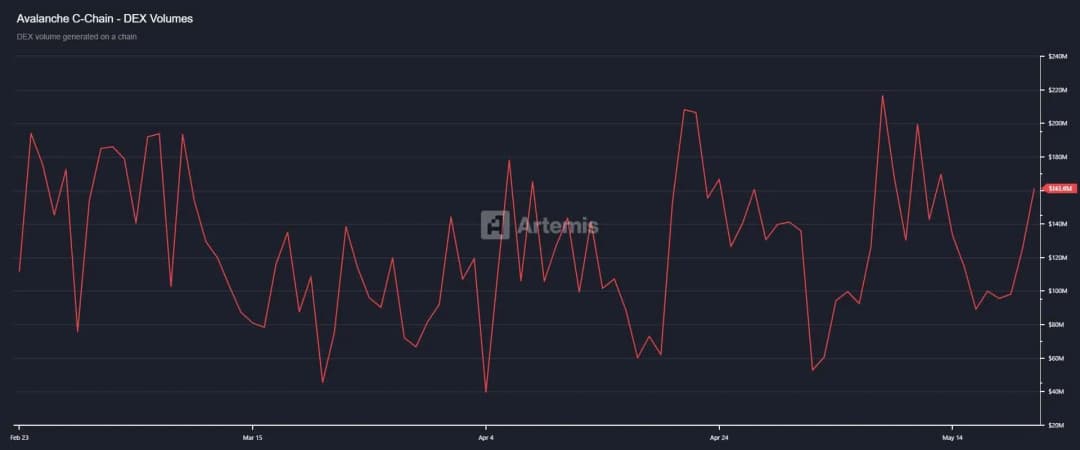در صرافیهای غیرمتمرکز (DEX)، حجم معاملات AVAX نیز در حال افزایش است و به ۱۶۱ میلیون دلار رسیده است. اگر این روند ادامه یابد، این دارایی میتواند به بالای ۲۰۰ میلیون دلار حجم بازگردد و قیمت خود را تقویت کند.