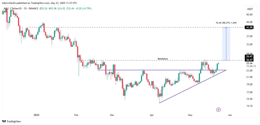نمودار AVAX همچنان قوی به نظر میرسد، اما ممکن است با مقاومت مهم ۲۶.۴۷ دلار مواجه شود. در صورت حفظ این مقاومت، AVAX ممکن است به الگوی مثلث صعودی بازگشته و در این محدوده معامله شود. با این حال، عبور موفق از این سطح میتواند قیمت را از ۲۶.۴۷ به ۴۱.۹۰ دلار—معادل ۵۸٪ رشد—بکشاند.