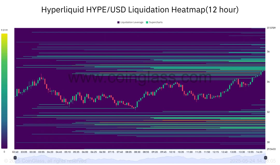 به جلو که نگاه کنیم، سطح کلیدی بعدی حوالی ۳۵.۵۰ دلار قرار دارد. بهگزارش CoinGlass، در این نقطه تقریباً ۲۰ میلیون دلار لوریج میتواند در صورت شکست صعودی آزاد شود.