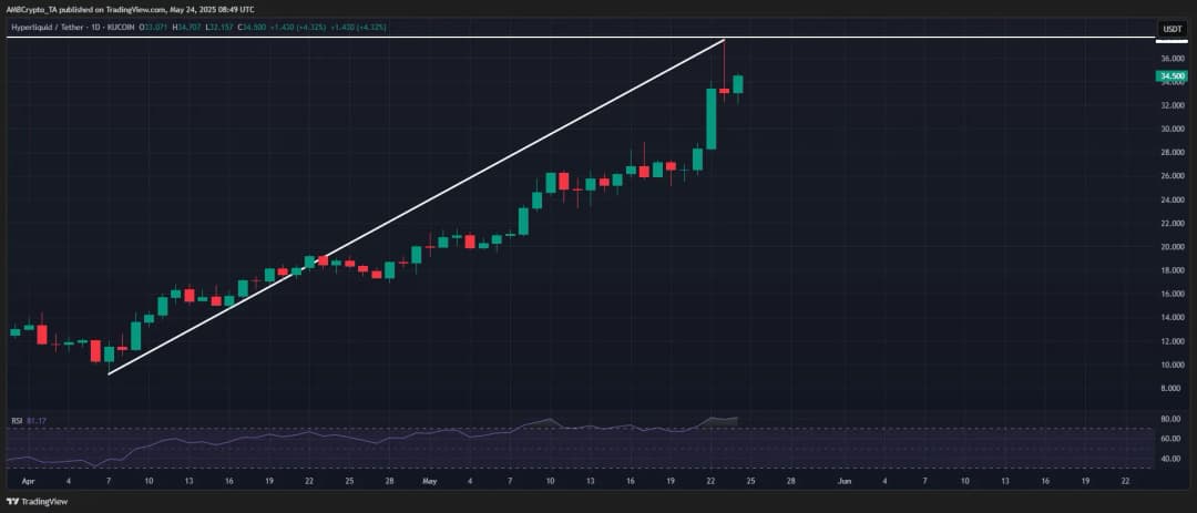 هر بار که HYPE سقف محلی جدیدی میساخت، فروشندگان استقراضی برای اصلاح قیمت وارد میشدند، اما این بار گاوها تسلیم نشدند. در ۲۳ می، شکست مقاومتی بهشدت برای خرسها دردناک بود و بیش از ۲۳ میلیون دلار پوزیشن استقراضی را نابود کرد.