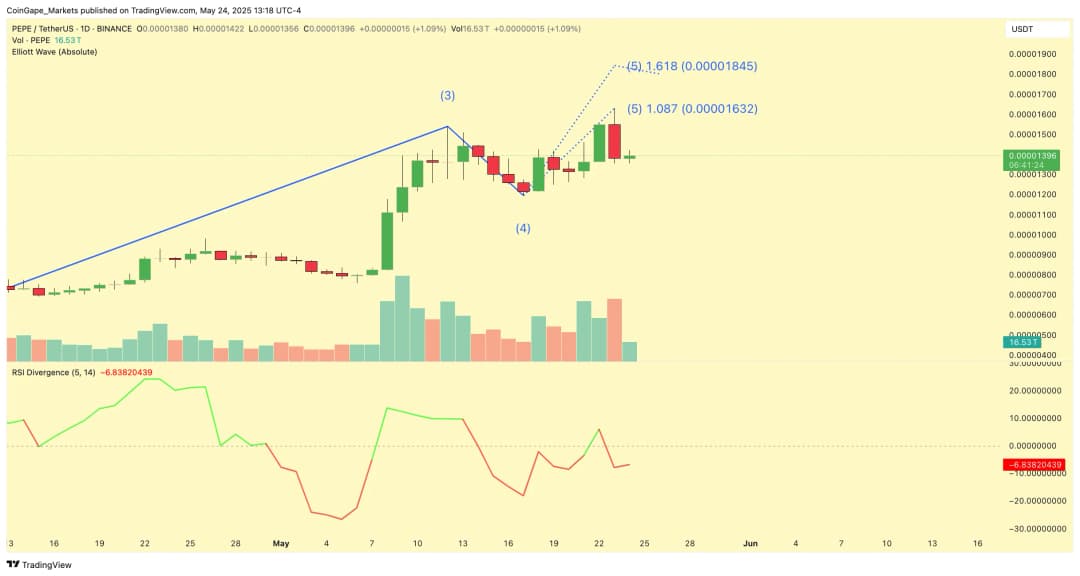 حرکت قیمت PEPE به نظر میرسد که برای یک جهش موج پنجم به سمت ۰٫۰۰۰۰۱۶۳۲ دلار و احتمالاً ۰٫۰۰۰۰۱۸۴۵ دلار آماده میشود، همانطور که ساختار امواج الیوت در نمودار روزانه نشان میدهد.