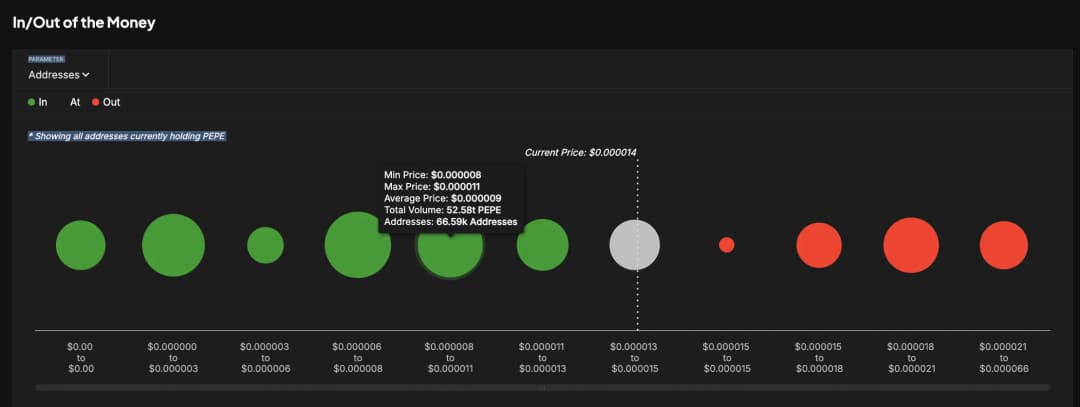 مهمتر اینکه، دادههای IntoTheBlock نشان میدهند که ۶۶٬۵۹۰ آدرس حدود ۵۸٫۵ تریلیون واحد PEPE را در حوالی قیمت ۰٫۰۰۰۱۱ دلار جمعآوری کردهاند و این پایه حمایتی قدرتمندی را دقیقاً زیر محدوده فعلی تقویت میکند.
