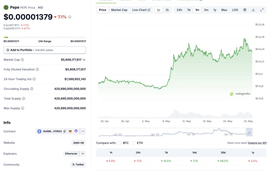 بر اساس دادههای CoinGecko، PEPE در ۷ روز گذشته ۱۰٫۵٪، در ۱۴ روز گذشته ۷٫۱٪ و در یک ماه اخیر ۵۹٪ رشد داشته است. این موضوع نشان میدهد که فروش ۲۴ ساعته ناشی از یک محرک جدید در بازار بوده است.