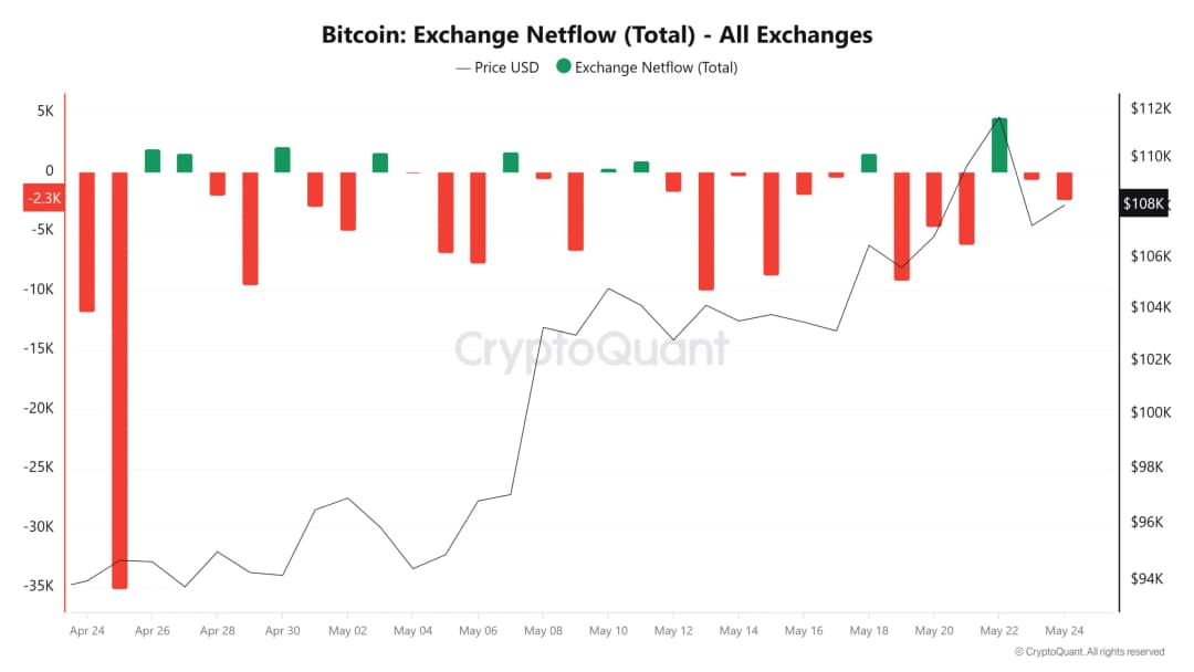 همزمان، خالص جریان وجوه به صرافیها عمدتاً منفی مانده است. سرمایهگذاران بیشتر بیت کوین از صرافی خارج میکنند تا اینکه به آن واریز کنند، که نشانهای از برتری انباشت نسبت به توزیع است.