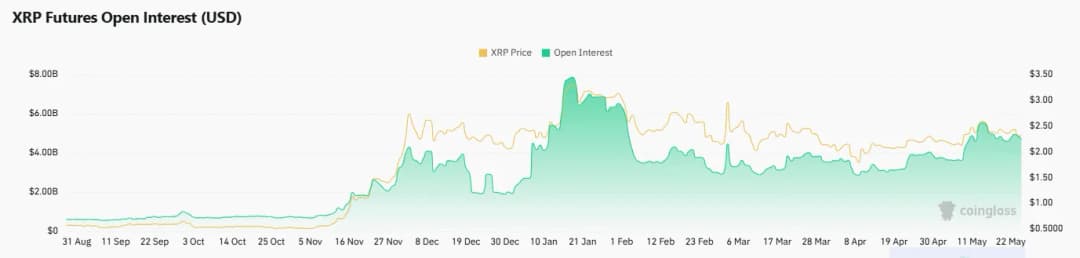 در همین حال، OI اتریوم در ۲۳ می رکورد ۳۳ میلیارد دلار را شکست و تنها در ماه می نزدیک به ۱۳.۵ میلیارد دلار افزایش یافت. سولانا (SOL) نیز در تلاش برای رسیدن به اوج ۸.۵۷ میلیارد دلاری خود است و در می تقریباً ۳ میلیارد دلار به OI خود افزوده است. پیام واضح است: نقدینگی در بازار آتی و توجه معاملهگران بهشدت به آلتکوینهای جایگزین چرخیده و XRP را از جریان اصلی دور کرده است.