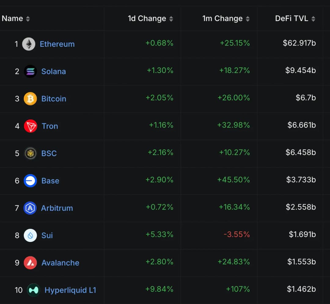 با اینکه سولانا از نظر ارزش بازار پنجمین ارز دیجیتال بزرگ است، اما در میان لایه یکها تنها اتریوم از آن پیشی گرفته و TVL سولانا ۹.۵ میلیارد دلاری از مجموع شبکههای لایه ۲ اتریوم شامل Base، Arbitrum و Optimism بیشتر است. همچنین از TVL بایننس چین که با بایننس و تراست والت یکپارچه است، پیشی گرفته است.