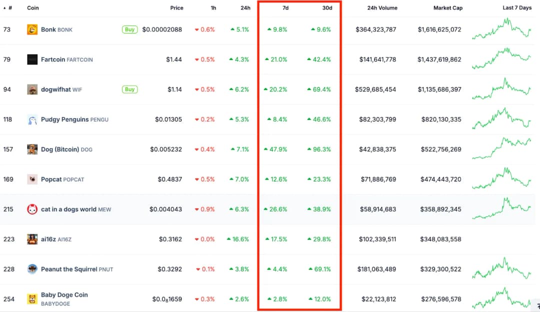 افزایش TVL سولانا همراه با رشد ارزش بازار ممکوینها بوده است. اکثر ممکوینهای مبتنی بر سولانا در بازههای هفتگی و ماهانه زیانهای دو رقمی را ثبت کردهاند و بسیاری از آنها ۵۰٪ تا ۸۰٪ با کفهای محلی فاصله دارند.