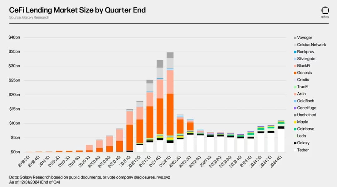 طبق گزارش گلکسی، حجم کل بازار وامدهی کریپتو، شامل مواضع بدهی با وثیقه کریپتو (CDP) متکی به استیبلکوینها، در سهماهه آخر ۲۰۲۴ به ۳۶.۵ میلیارد دلار رسیده است که ۴۳٪ کمتر از اوج ۶۴.۴ میلیارد دلاری در سال ۲۰۲۱ است. با وجود این انقباض، پلتفرمهای وامدهی زنجیرهای شاهد جهش قابلتوجهی بودهاند و حجم موقعیتهای باز به ۱۹.۱ میلیارد دلار در سهماهه چهارم ۲۰۲۴ افزایش یافته است که رشد ۹۵۹٪ را در طول دو سال نشان میدهد.