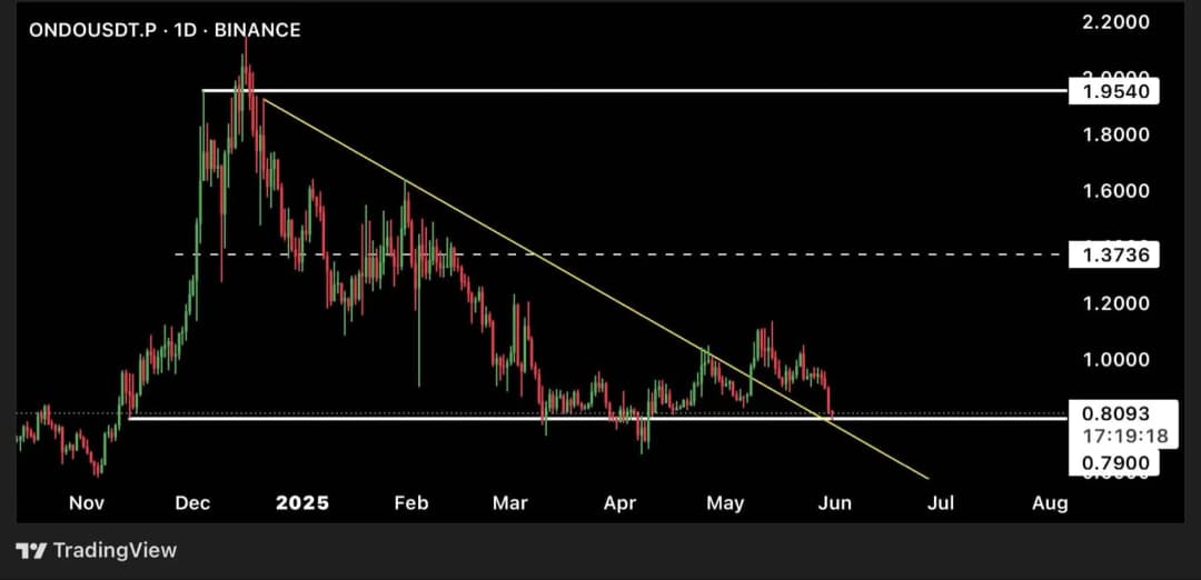تا زمان نگارش این گزارش، ONDO در قیمت ۰.۸۰۹۳ دلار معامله میشود و نزدیک حمایت کلیدی ۰.۸۰ دلار قرار دارد. این سطح در آوریل بهعنوان آخرین سنگر در برابر روند نزولی عمل کرد و پس از شکست خط مقاومت نزولی در اوایل می، بار دیگر بازآزمایی شد.
