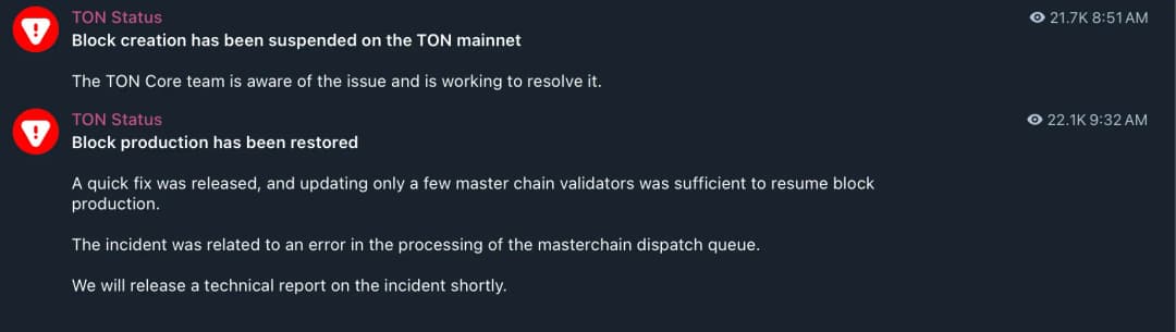 شبکه مستقل لایه اول TON (The Open Network) که رابطهای متقابل با پلتفرم پیامرسان تلگرام دارد، روز اول ژوئن دچار قطعی کوتاهمدت شد و تولید بلاک برای مدتی متوقف گردید. تیم توسعه TON ساعت ۱۲:۵۱:۰۰ UTC این مشکل را اعلام کرد و تقریباً ۴۰ دقیقه بعد عملکرد شبکه را بازیابی نمود.