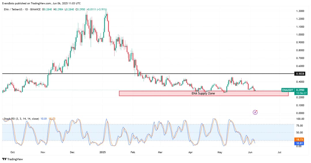 ENA در محدوده عرضه کلیدی ۰.۲۸ تا ۰.۳۱ دلار در حال تثبیت بود؛ سطحی که پیشتر نقش حمایت و مقاومت را ایفا کرده است. هنگام نگارش گزارش، قیمت پس از برگشت از ۰.۲۸۴ دلار روی ۰.۲۹۵ دلار قرار داشت. مقدار Stochastic RSI روی ۱۰.۸۱ قرار گرفته که نشاندهنده شرایط اشباع فروش عمیق است و معمولاً پیش از بازگشتهای کوتاهمدت دیده میشود. با این حال، علیرغم برگشت تکنیکال، روند نزولی بزرگتر همچنان پابرجاست و سطح ۰.۵۰۲۸ دلار بهعنوان مقاومت بلندمدت حیاتی عمل میکند. برای شروع حرکت صعودی معنادار، ENA به جنبش قویتری برای عبور از این محدوده نیاز دارد.