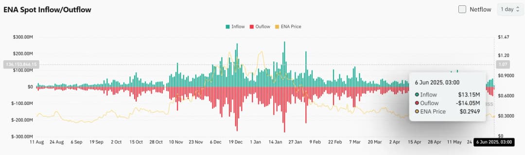 در تاریخ ۶ ژوئن، بازارهای اسپات ۱۳.۱۵ میلیون دلار جریان ورودی ENA و ۱۴.۰۵ میلیون دلار جریان خروجی ثبت کردند که منجر به جریان خالص کمی منفی شد. با این حال، CVD خریداران اسپات در پنجره ۹۰ روزه همچنان نشاندهنده تسلط خریداران است. این یعنی باوجود احساس نزولی، خریداران به استفاده از سفارشات بازار تهاجمی ادامه میدهند. بنابراین، درحالیکه سیگنالهای درونزنجیرهای ضعف را نشان میدهند، بازار اسپات علائم انباشت را به نمایش گذاشته است. این اختلاف میان موقعیتگیری فروش و اجرای خرید، پویایی پیچیدهای ایجاد کرده که جهت حرکت قیمت در چند جلسه آینده به تسلط یکی از این دو سمت بستگی دارد.