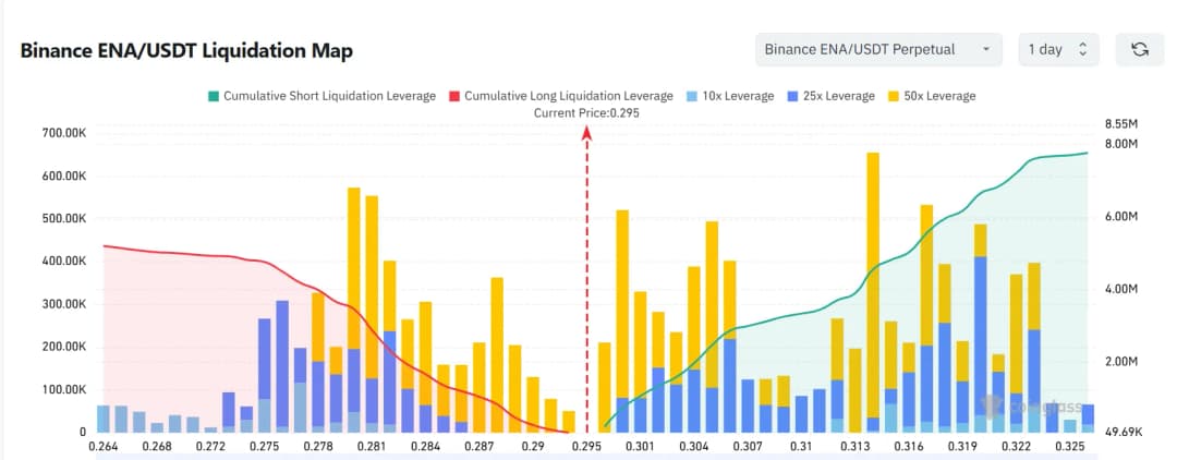 نقشه حرارتی لیکوئیدیشن بایننس نشاندهنده خوشهای از لیکوئید شدنهای شورت بین ۰.۳۰۵ تا ۰.۳۲۵ دلار است. قیمت ۰.۲۹۵ دلاری در زمان نگارش درست پایین این محدوده حیاتی قرار دارد. بنابراین هر حرکت صعودی به این ناحیه میتواند منجر به فشردگی شورت و تسریع رشد قیمت شود. بهعکس، ریسک نزولی قابل توجه است چراکه لیکوئید شدنهای لانگ انباشته زیر ۰.۲۸ دلار انباشته شدهاند. این فشارهای متضاد زمینه را برای نوسان فراهم کردهاند و معاملهگران باید برای تأیید جهت حرکت کوتاهمدت به شکست بالای ۰.۳۰۵ دلار یا شکست زیر ۰.۲۸ دلار توجه کنند.