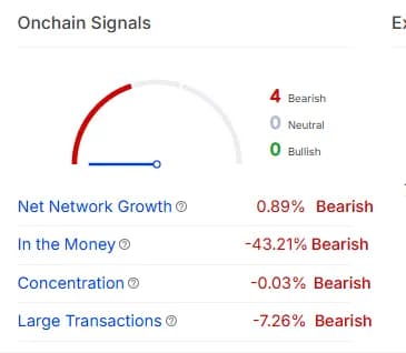 هرچند ورود نهنگها به صرافی معمولاً نشانه فروش است، اما همیشه به فروش فوری منجر نمیشود. بنابراین حرکت قیمت در کوتاهمدت بستگی زیادی به واکنش بازار به این افزایش ناگهانی نقدینگی دارد. شاخصهای درونزنجیرهای در تمام معیارهای اصلی Ethena همچنان کاملاً نزولی هستند. بیش از ۵۶٪ دارندگان در ضرر قرار دارند و شاخص «In the Money» روی -۴۳.۲۱٪ ایستاده است که حاکی از کاهش اعتماد به نگهداری، بهویژه در میان شرکتکنندگان کوتاهمدت است.