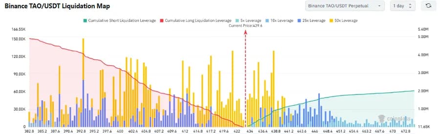 قیمت TAO در ۴۲۹.۶ دلار در آستانه شکست یک حمایت مهم قرار دارد و در صورت فروش شدید میتواند به سرعت پایین برود. اگر قیمت به ۴۱۷ دلار برسد، احتمالا حجم بزرگی از موقعیتهای لانگ لیکویید میشود. در طرف مقابل، اگر قیمت از ۴۳۵ دلار عبور کند، فروشندگان شورت مجبور به خروج سریع خواهند شد و این میتواند به رشد تند قیمت منجر شود.