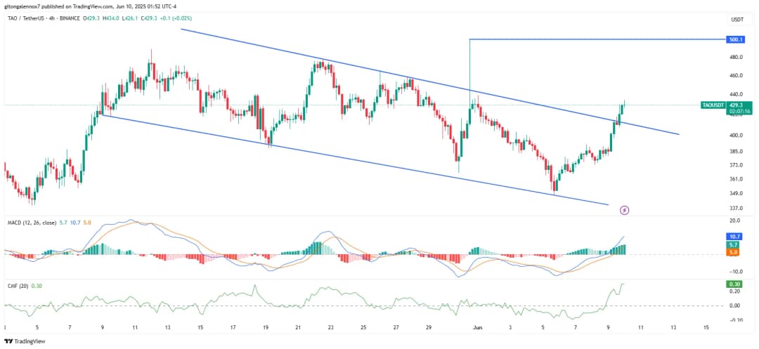 TAO موفق شده از سقف کانال نزولی خود عبور کرده و سطح ۴۲۹.۳ دلار را بشکند که نشانه تغییر جهت روند و افزایش قدرت خریداران است. اندیکاتور MACD عدد ۱۰.۷ را نشان میدهد و بالاتر از خط سیگنال ۵.۰ قرار دارد و مقدار هیستوگرام ۵.۷ است که همگی از تقویت روند صعودی حکایت دارند. همچنین Chaikin Money Flow روی عدد ۰.۳۰ قرار داشته و نشان میدهد سرمایه همچنان به بازار وارد میشود و چشمانداز صعودی TAO را تقویت میکند.