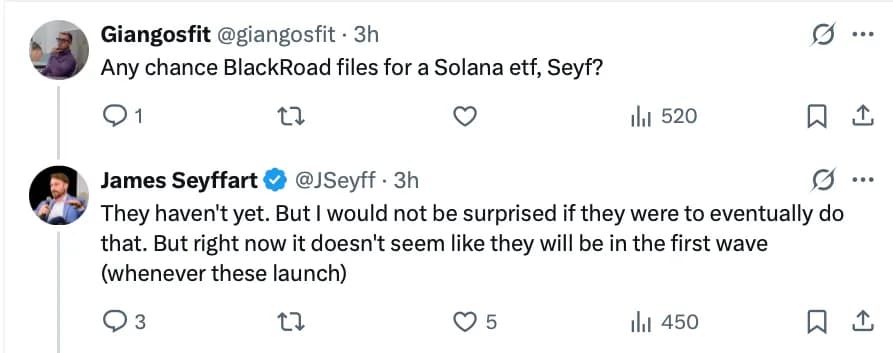 در تاریخ ۱۳ ژوئن، هفت متقاضی ETF سولانا (Solana) بیانیه S-1 خود را نزد کمیسیون بورس و اوراق بهادار آمریکا (SEC) ثبت کردند؛ اما جیمز سیفارت، تحلیلگر ETF در بلومبرگ، معتقد است که احتمال تایید این درخواستها به این زودی وجود ندارد.