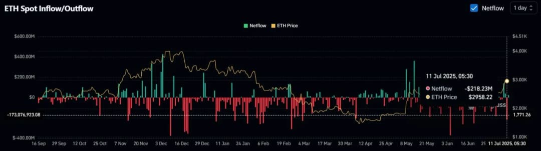 در ۱۱ ژوئیه، خالص جریان خروج اتریوم از صرافیها بیش از ۲۰۶ میلیون دلار بوده که معمولاً نشاندهنده خرید نهنگها و کاهش نقدینگی سمت فروش است و سیگنال صعودی محسوب میشود. البته این جریان خروج بالا همزمان با کاهش ۳۵ درصدی حجم معاملات روزانه در ۲۴ ساعت گذشته رخ داده که مسیر قیمت در کوتاهمدت را تا حدودی مبهم میکند.
