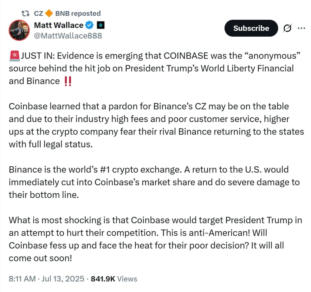 چانگپنگ ژائو (CZ)، همبنیانگذار و مدیرعامل سابق بایننس، توییتی را بازنشر کرده که در آن ادعا شده است کوینبیس منبع ناشناس پشت گزارش بلومبرگ بوده که پروژه رمز ارزی ترامپ، World Liberty Financial، و بایننس را هدف قرار داده است.