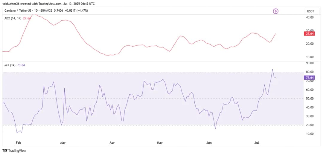 شاخصهای تکنیکال نیز این روایت صعودی را تایید میکنند و روند صعودی و وجود نقدینگی کافی را نشان میدهند. شاخص جهتدار متوسط (ADX) هم به ۲۷.۶۴ رسید که بیانگر شکلگیری یک روند قدرتمند است. در تاریخچه بازار، مقادیر بالای ۲۵ برای ADX نشانه قطعی بودن روند است.