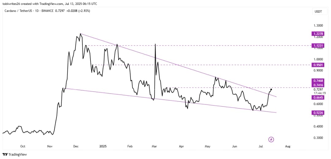 با این حال، یک مانع در مسیر قرار دارد. برای تثبیت این رالی صعودی، کاردانو باید از مقاومت ۰.۷۴۶۸ دلار عبور کند؛ سطحی که میتواند فشار فروش زیادی ایجاد کند و قیمت را دوباره به پایین بکشد. اگر کاردانو موفق به عبور از این سطح نشود، امکان بازگشت مجدد قیمت به کانال نزولی وجود دارد. اما در صورت حفظ شتاب صعودی، قیمت این ارز حتی میتواند تا محدوده ۰.۹۵ تا ۱.۱۲ دلار افزایش یابد و طبق پیشبینیهای TradingView، هدف ۱.۲۲ دلاری هم مطرح شده است.